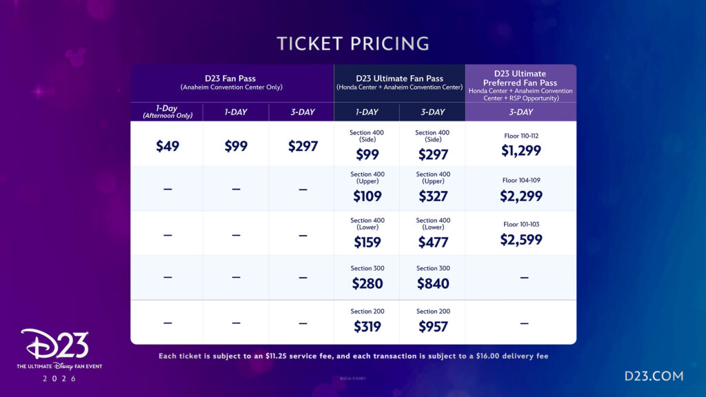 - D23 Ultimate Fan Pass, which includes access to both the Anaheim Convention Center and the Honda Center showcases, with pricing beginning at $99 for a 1‑Day and $297 for a 3‑Day package