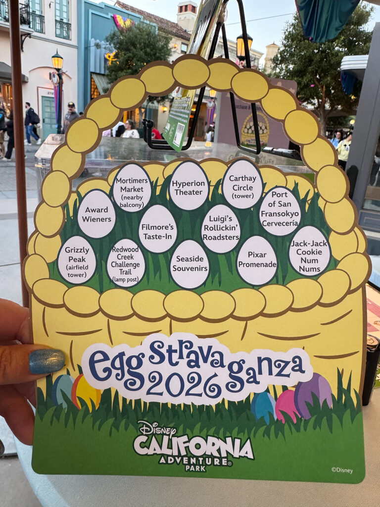 Monday is the last day to complete the Egg-Stravaganza promotion at the Disneyland Resort. A dozen oversized eggs decorated with images of Disney characters have been placed around each of the three hunt locations – Disneyland, Disney California Adventure and the Downtown Disney district. Egg hunters first purchase a special map and stickers to help locate these eggs, then place the stickers on the corresponding spots on the map.