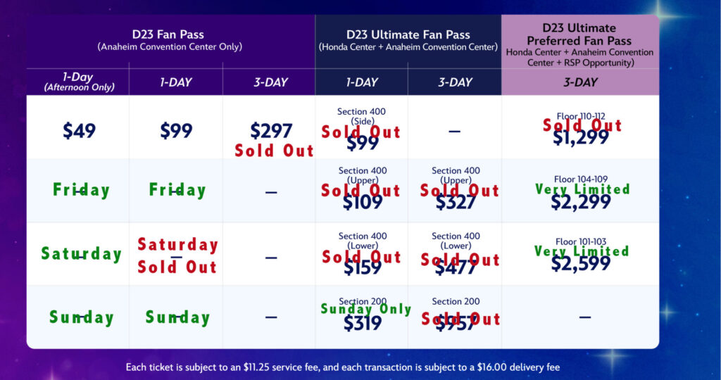 The chart above details the tickets that were still available as of Sunday evening to attend D23: The Ultimate Disney Fan Event this August 14, 15, and 16, 2026. The online counter showed more than 70,000 people in the virtual queue when tickets went on sale last week, and the most affordable tickets were quickly snapped up.