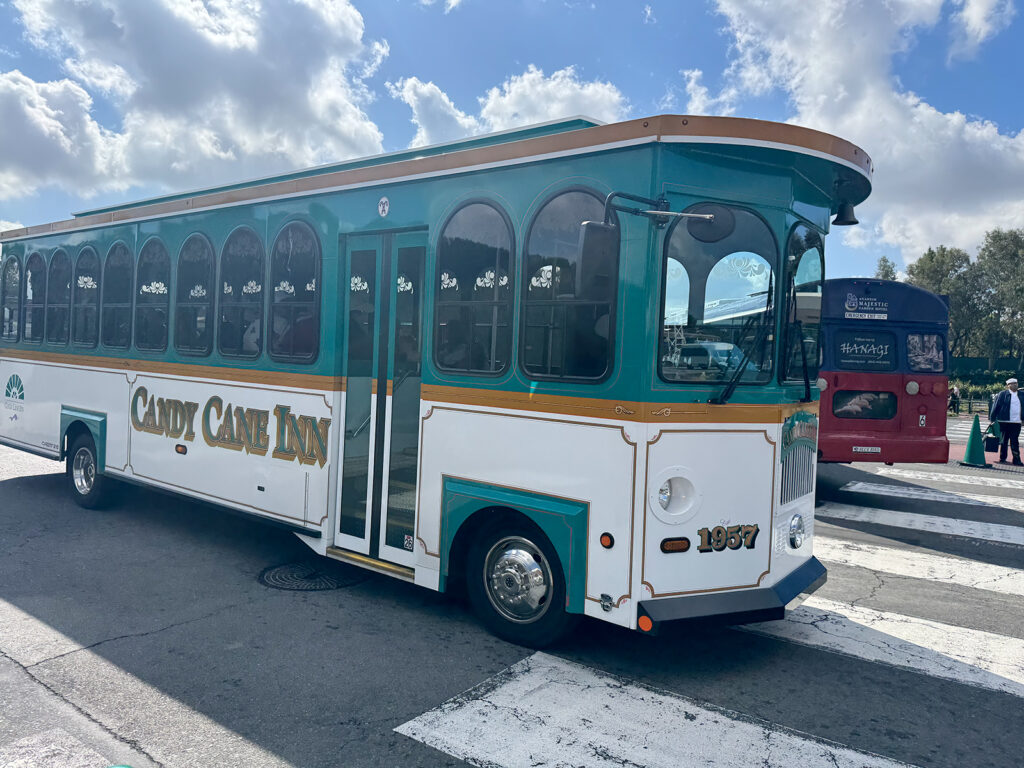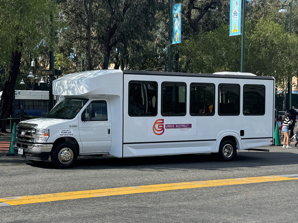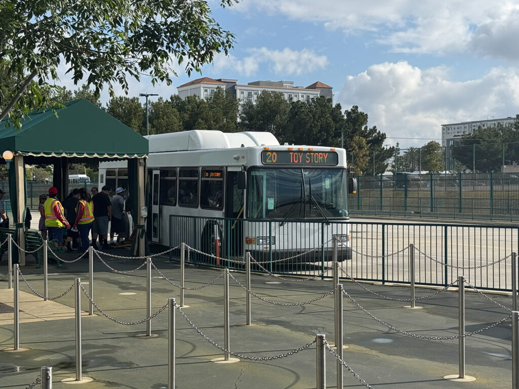 Disney has contracted with Mosaic Global Transportation to provide bus service between the Toy Story parking lot and the Disneyland entrance. Mosaic is the company which also operates the cast member shuttle buses at the Resort.