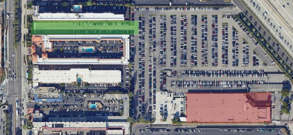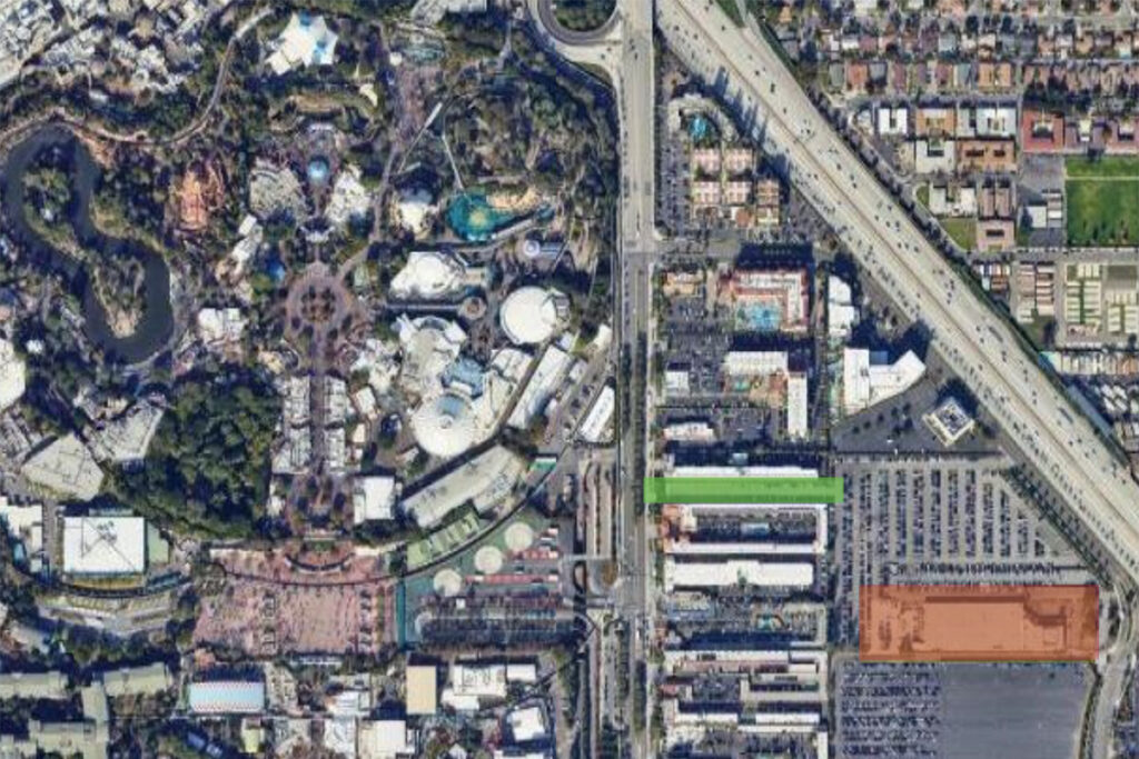 For a little more context, the photos below show the location of the building to be demolished (highlighted in red) relative to the Disneyland Resort. The area highlighted in green is the parcel, currently used for parking, which will connect the new parking structure to the Disneyland Resort main entrance via a pedestrian bridge over Harbor Blvd.