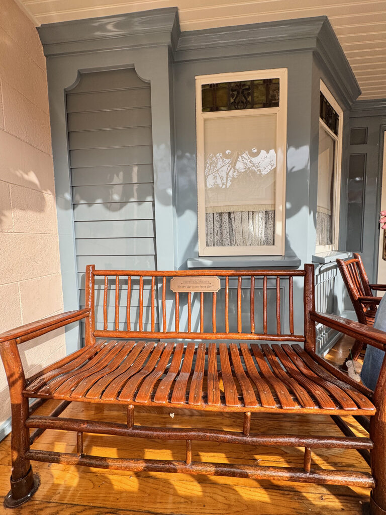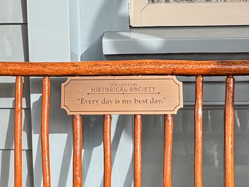 The plaque reads simply, “Every day is my best day,” and bears the heading of the New Century Historical Society. The phrase was the motto of a regular Disneyland visitor named Frank, who called himself the “Porch Potato” and was unofficially dubbed the Mayor of Main Street. Most days Frank could be found on the porch people watching, often joined by his “porch family.”