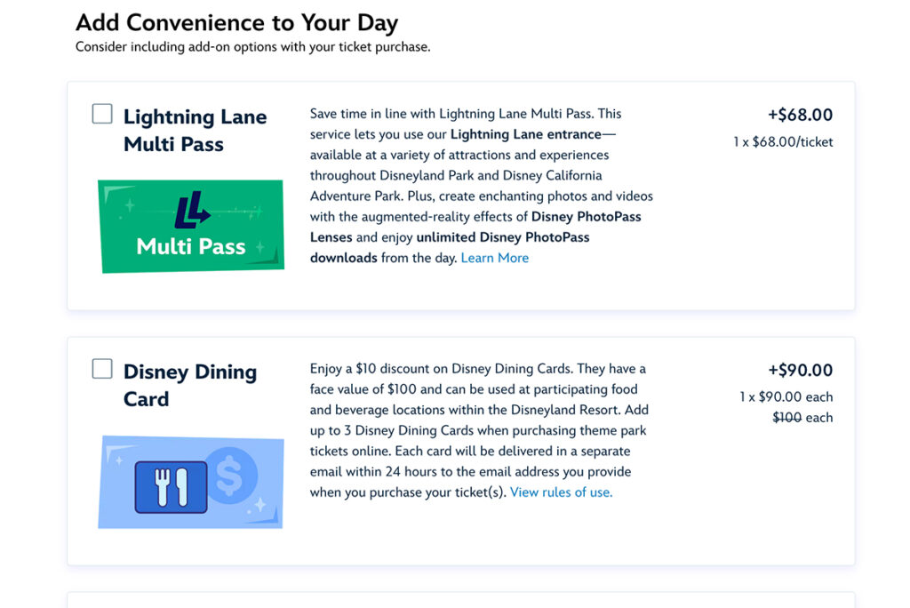 Visitors purchasing Disneyland tickets may be offered the chance to purchase Disney dining cards at a 10% discount during checkout. The offer is good for $100 Disney dining cards only, with a limit of three cards per transaction. We don’t know when this offer first appeared, and we’ve been told it’s a limited time promotion which can be discontinued at any time. It appears this offer is only available when you purchase tickets directly through Disney, and is not available through authorized ticket sellers.
