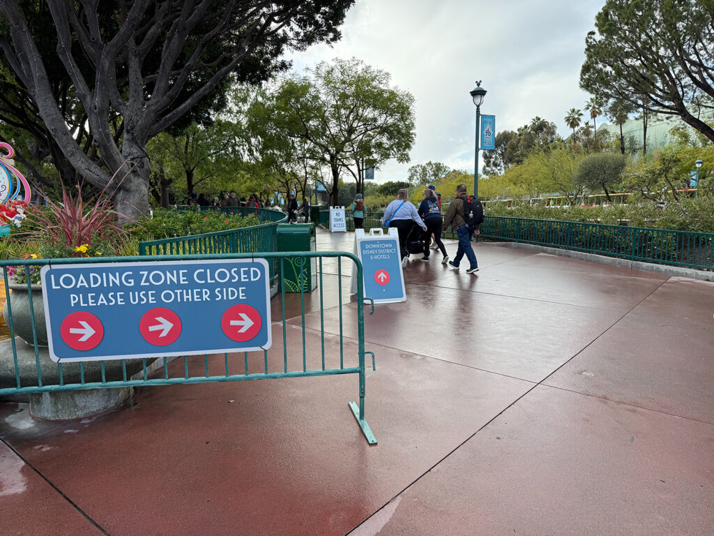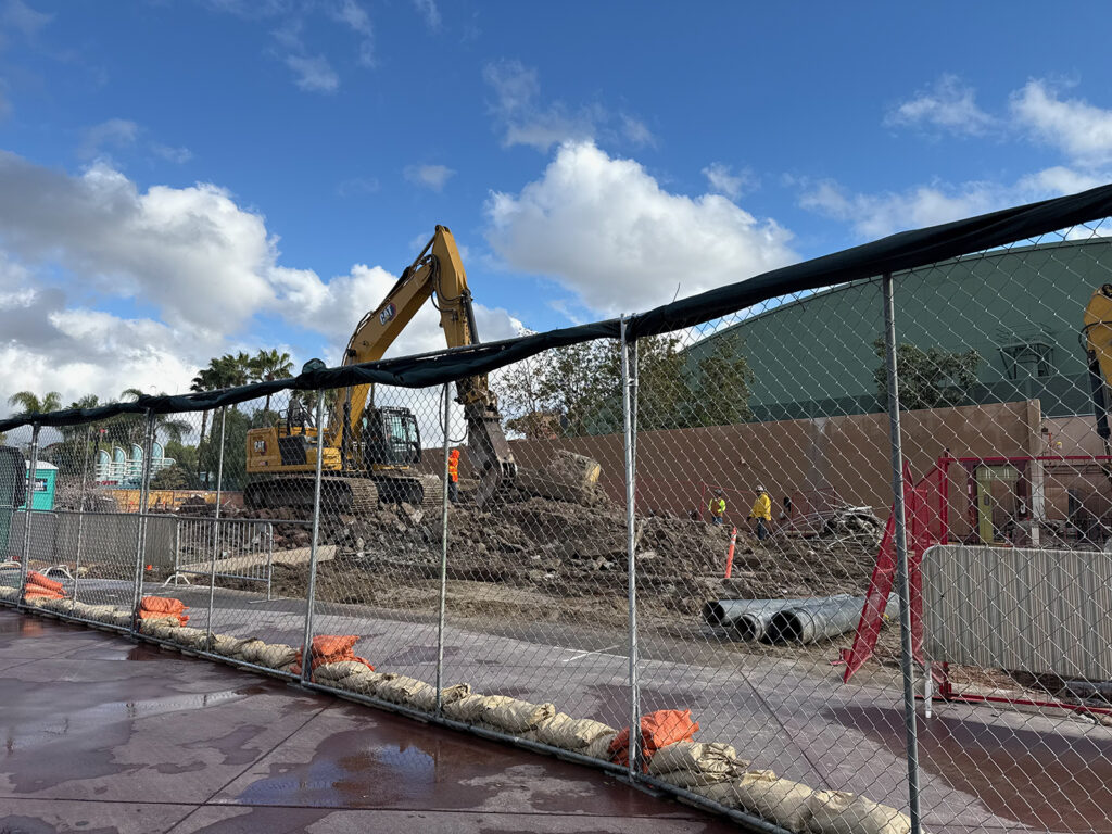 The construction of a new Porto’s Bakery in Downtown Disney continues to create detours through the area, especially in the load and unload areas for the Mickey and Friends tram and around the World of Disney store. The current detour has pedestrians using the usual tram loading area on the south side of the tram drive to bypass the construction site, but this path can be narrow in parts. For some of the day, trams both load and unload on the north side of the tram drive, near the Monorail tracks.