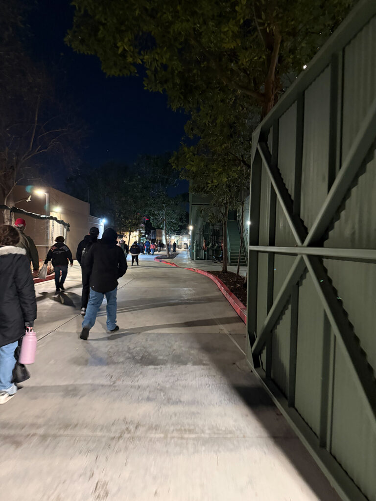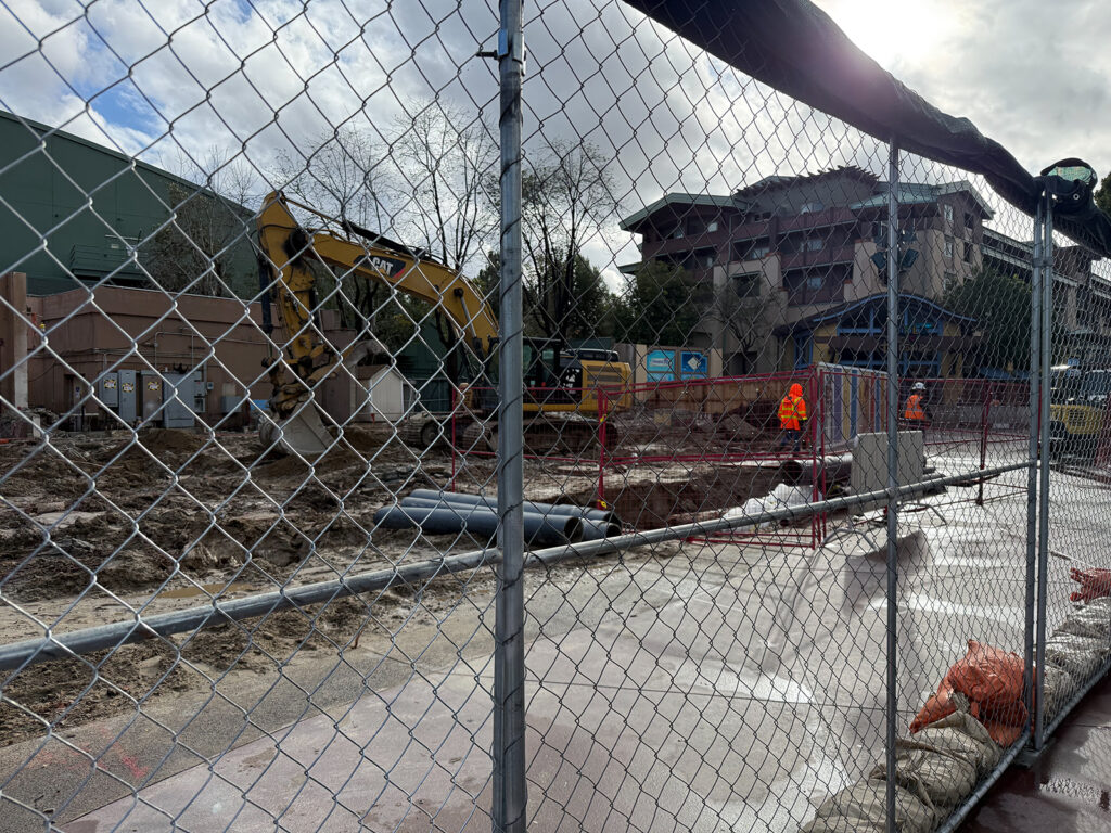 At night, Disney has been using a backstage corridor behind Soarin’ Over California in Disney California Adventure to route visitors around the construction site. These photos are from our last visit, but construction walls move nightly.