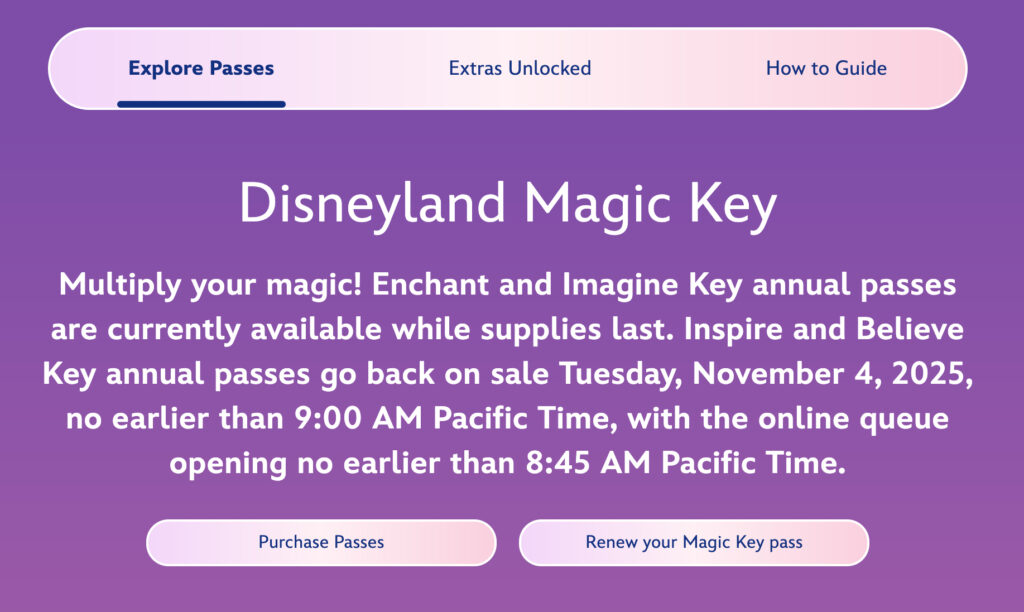 When Disneyland last made Magic Keys available for new purchase, only the Enchant and Imagine Keys were offered. The higher-tier Inspire and Believe Keys have not been available since this summer, though Disney did include them in the most recent price increase.
