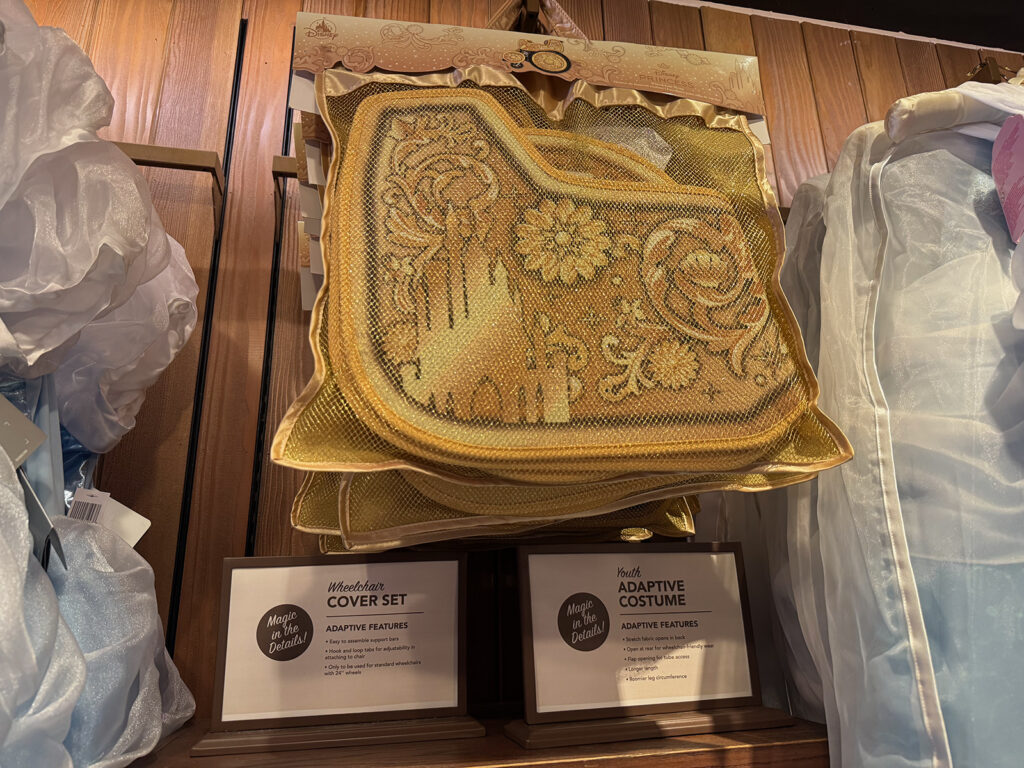 Looking at the costume offerings, Justin noted that Bibbidi Bobbidi Boutique has at least one adaptive costume and wheelchair covers in stock. These costumes are designed to be easier for wheelchair-users to wear, and some have discrete access ports for tubes. It’s nice to see them available here, as the Disney Store website only carries them around Halloween and they sell out quickly.