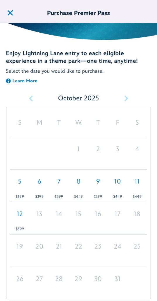 Disneyland’s Lightning Lane Premier Pass is an add-on product which grants one-time access to each Lightning Lane attraction at both Disneyland and Disney California Adventure without having to schedule arrival times. Pricing varies by day, and this add-on is available to purchase only up to 7 days in advance. Last week we noticed that the price for Wednesday, October 8 was $449 per person, the highest it has been priced since Disney introduced the product last year.