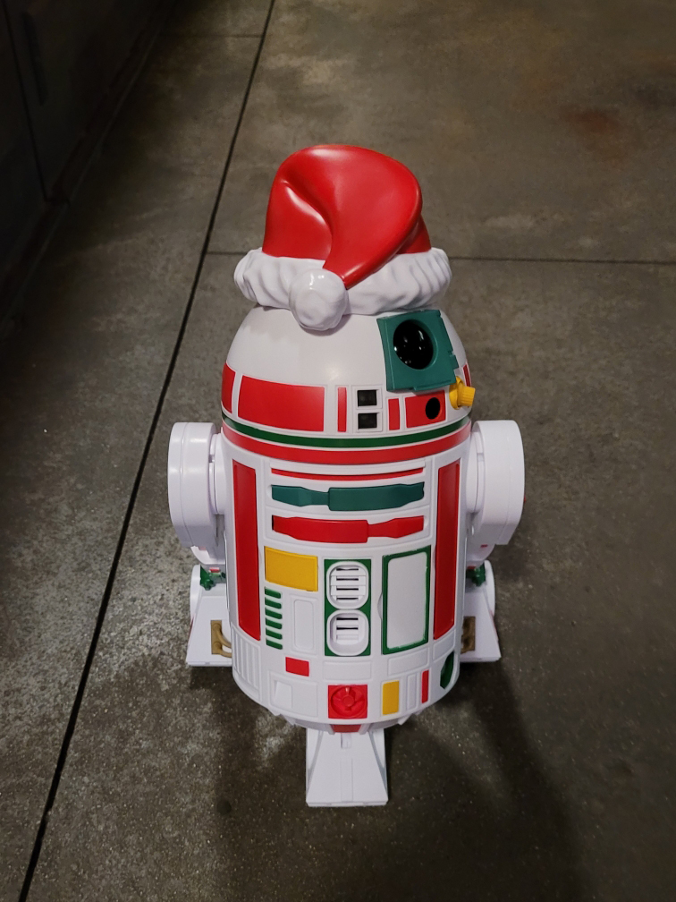 …MousePlanet reader Karin sent in this photo of a new remote-control droid available at the Disneyland Resort. “R2-H15” is a much larger version of a toy released a decade ago, and comes complete with a jolly Santa hat and a “holiday personality chip.” The droid retails for $130.