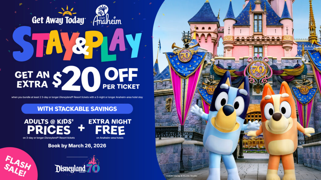 You can receive an extra $20 off per ticket when you book a qualifying Disneyland vacation package through Get Away Today. This deal is stackable with all of the discounts already available through Get Away Today, including: