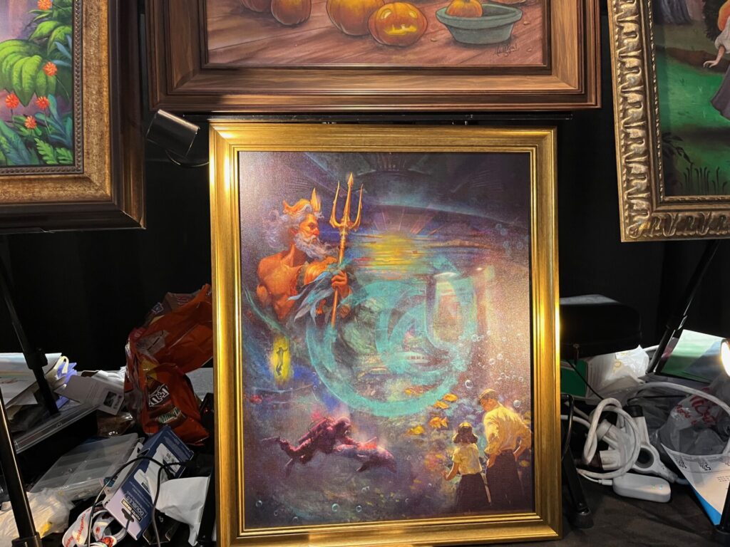 This year, James was featuring a stunning new piece — a tribute to The Living Seas at Epcot, before Nemo and friends ever swam their way into the pavilion. It’s classic Epcot through and through, full of those retro-futuristic blues and silvers that defined that original era. The kind of artwork that makes you stop and remember when Epcot was about discovery, imagination, and the magic of our planet’s oceans.