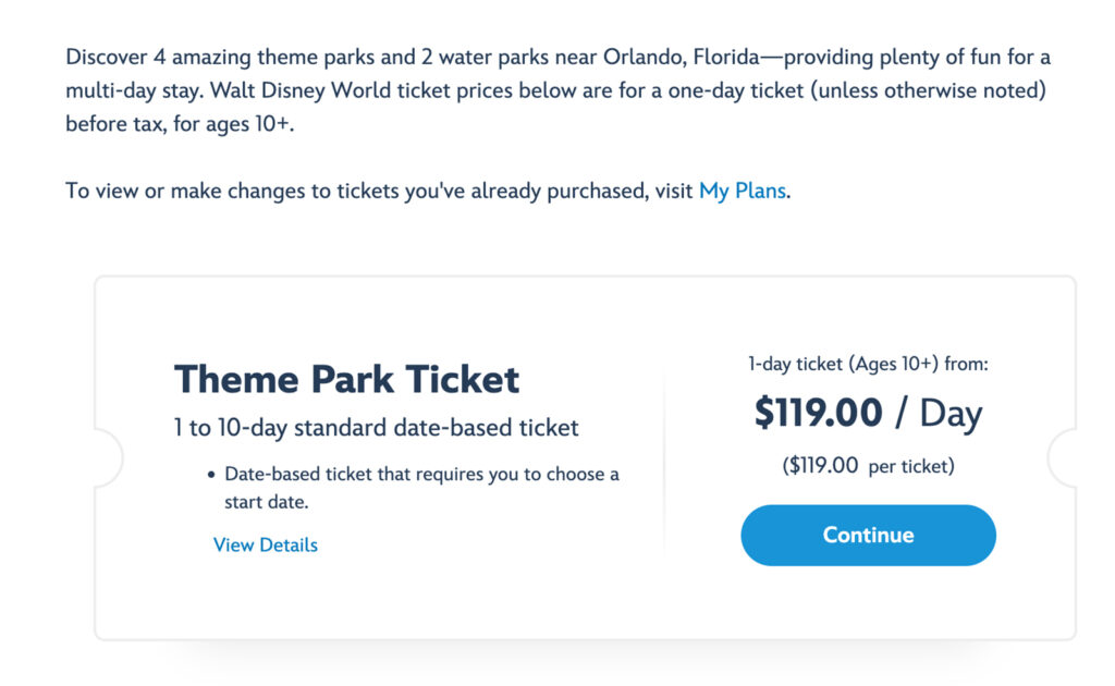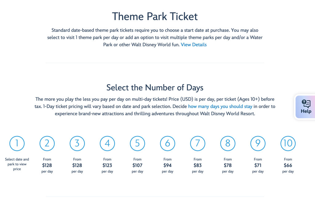 Note that each ticket has a “Starting From” price. If you view the Walt Disney World ticket calculator, you’ll see that there are very few dates at that lowest price – in many cases only one or two in the year. August and September are the least-expensive times to visit; November and December have the highest prices.