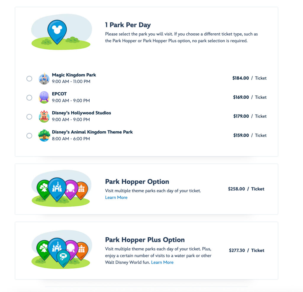 Unlike the California resort, where we can share the pricing structure with you in one, easy-to-digest chart, Walt Disney World uses a labyrinthine pricing structure, where the cost of a ticket is based on which park(s) you’ve visiting, how many days you’re staying, and what day you plan to first use your ticket. Without getting into 100 different pricing scenarios, we’re going to present the ranges you can expect to pay for your visit, based on ticket type.